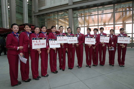 Staff from China Southern Airlines wait for delegates from all over the country to arrive for the 17th National Congress of the Communist Party of China (CPC) at Beijing Capital International Airport October 12, 2007. A total of 2,217 delegates have been elected to attend the upcoming national event, which will begin on October 15. [Xinhua]