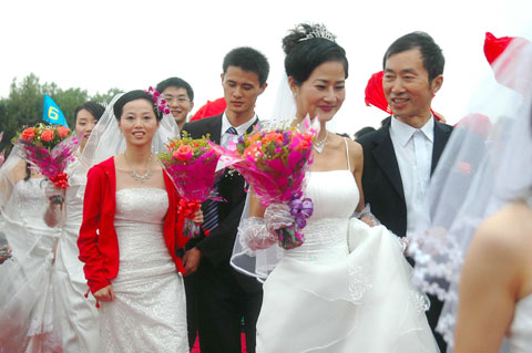 Newlywed couples walk on a bridge in the West Lake in Hangzhou, Zhejiang Province October 13, 2007. About 100 couples from across the country took part in the mass wedding ceremony. [newsphoto]