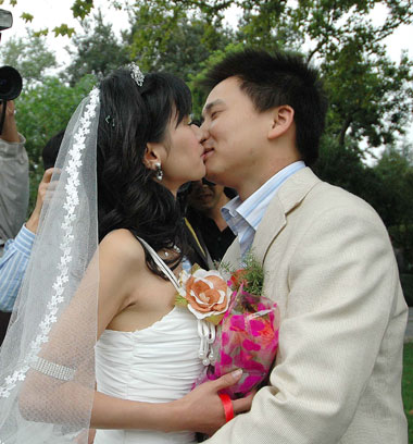 A bridegroom kisses his bride at a mass wedding ceremony in Hangzhou, Zhejiang Province October 13, 2007. About 100 newlywed couples from across the country took part in the ceremony. [newsphoto]
