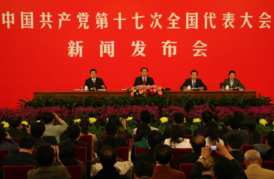 The 17th National Congress of the Communist Party of China (CPC) holds a press conference in Beijing, October 14, 2007. The congress, to be held from October 15 to 21, will decide China's new leadership and the path China will follow in the next five years or more. [Xinhua]