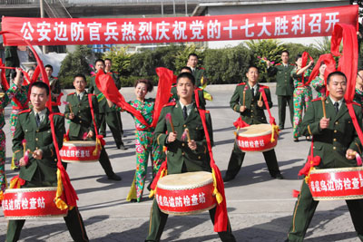 Updated: 2007-10-15 21:45 ![]() Soldiers beat drums during a ceremony to celebrate the opening of the 17th National Congress of the Communist Party of China (CPC) in Beijing October 15, 2007. [Xinhua]