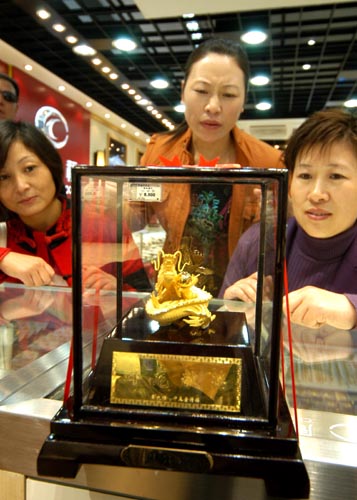 Customers look at a statue made of gold in a department store in Lianyungang, East China's Jiangsu Province on October 15, 2007. October is the peak season for selling gold ornaments. [newsphoto]