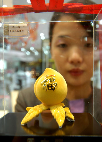 A saleswoman looks at a gold statue in the shape of a peach with the Chinese character "Fu" meaning "blessing" in a department store in Lianyungang, East China's Jiangsu Province on October 15, 2007. October is the peak season for selling golden ornaments. [newsphoto]