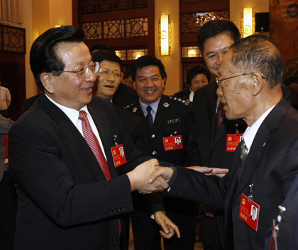 ![]() Zeng Qinghong (L), member of the CPC Central Committee Politburo Standing Committee, shakes hands with a deputy as he attends the group discussion of the Jiangxi Province delegation of the 17th National Congress of the Communist Party of China in Beijing, October 15, 2007. [Xinhua]