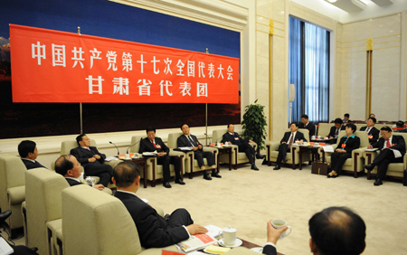 Delegates of Gansu Province sit for a discussion session of the 17th National Congress of the Communist Party of China in Beijing on October 16, 2007. The 17th Party congress opened in Beijing on Monday, 2007. [Xinhua]