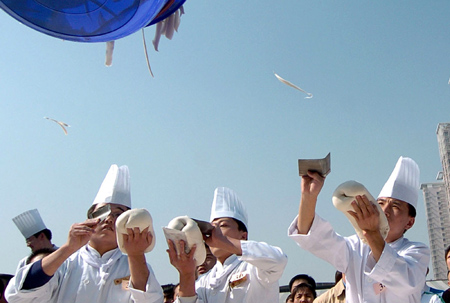 Contestants compete in making dough slices during a contest in cooking food made with flour in Taiyuan, North China's Shanxi Province, October 15, 2007. [Xinhua]