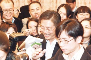 Tu Guangshao, vice-chairman of the China Securities Regulatory Commission (CSRC), is surrounded by journalists at the media center of the 17th Party Congress in Beijing, October 17, 2007. [China Securities Journal]