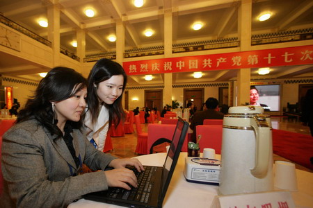 Journalists work at a lobby in the Great Hall of the People in Beijing before the closing session of the Party's 17th National Congress October 21, 2007. The Closing Session was started at 9:00 am on Sunday, at which a new CPC Central Committee and the Central Commission for Discipline Inspection would be elected. [Xinhua]