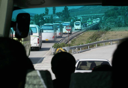 Coaches line the main road near Xichang Satellite Launch Center in Southwest China's Sichuan Province, October 24, 2007, as visitors arrive to have a closer look at the launch of China's first lunar probe, Chang'e I. [Xinhua]