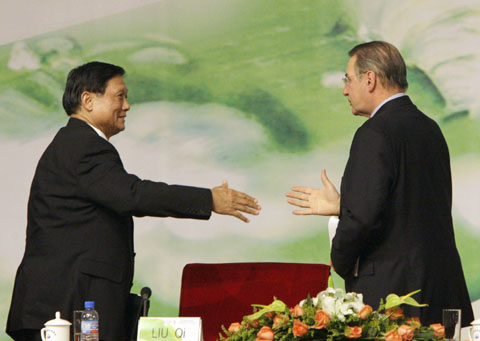 International Olympic Committee (IOC) President Jacques Rogge (R) shakes hands with Qi Liu, President of the Beijing Olympic Organising Committee (BOCOG), during the opening of the Convention of the World Sports and Environment in Beijing October 25, 2007. [Reuters]