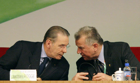 International Olympic Committee (IOC) chief Jacques Rogge (L) speaks with Pal Schmitt (R), Chairman of the Sports and Environment Commission, during the opening of the Convention of the World Sports and Environment in Beijing October 25, 2007. [Reuters]