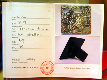 Updated: 2007-10-31 11:14 ![]() Certificate of the Seal of King of Yelang is displayed at a press conference in Guiyang, Southwest China's Guizhou Province, October 30, 2007. Yelang was an ancient minor kingdom in what is now Guizhou Province during the Han Dynasty (206 BC–220 AD). The seal was made public by a Miao ethnic man who claimed to be the 75th descendant of the king. [newsphoto] |