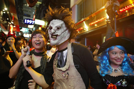 Revellers dressed as ghosts celebrate Halloween at Lan Kwai Fong, one of the most famous destinations for tourists in Hong Kong Oct 31, 2007. [Xinhua]