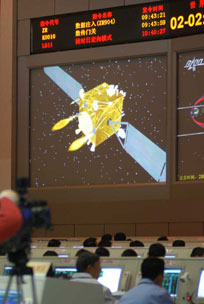 A screen displays a simulated image of Chang'e I as it carried out orbital corrections, November 2, 2007. [Xinhua]