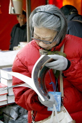 A woman reads a book in the Beijing Autumn Book Fair at the Ditan Park of Beijing, November 2, 2007. The 2007 Beijing Autumn Book Fair opened on Friday. Around 200,000 kinds of books from over 500 enterprises were displayed in the fair. [newsphoto]