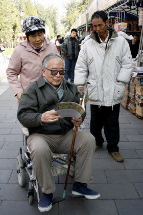 An elderly reads a book when accompanied by his family in the Beijing Autumn Book Fair at the Ditan Park of Beijing, November 2, 2007. The 2007 Beijing Autumn Book Fair opened on Friday. Around 200,000 kinds of books from over 500 enterprises were displayed in the fair. [newsphoto]