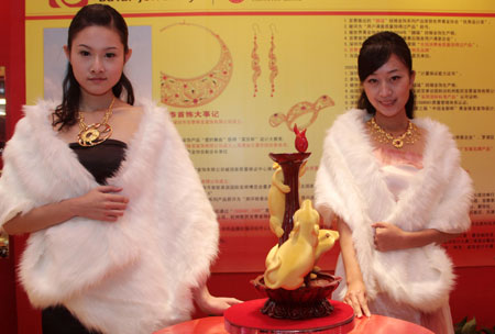 Models present the golden mice ornaments during the 2007 China International Jewellery Show at China International Exhibition Center in Beijing, November 1, 2007. [newsphoto]