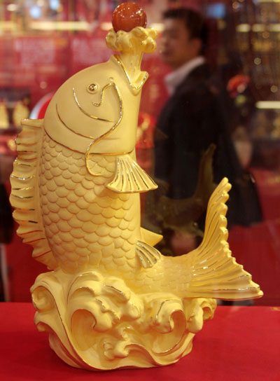 Golden fish ornament is on display during the 2007 China International Jewellery Show at China International Exhibition Center in Beijing, November 1, 2007. [newsphoto]