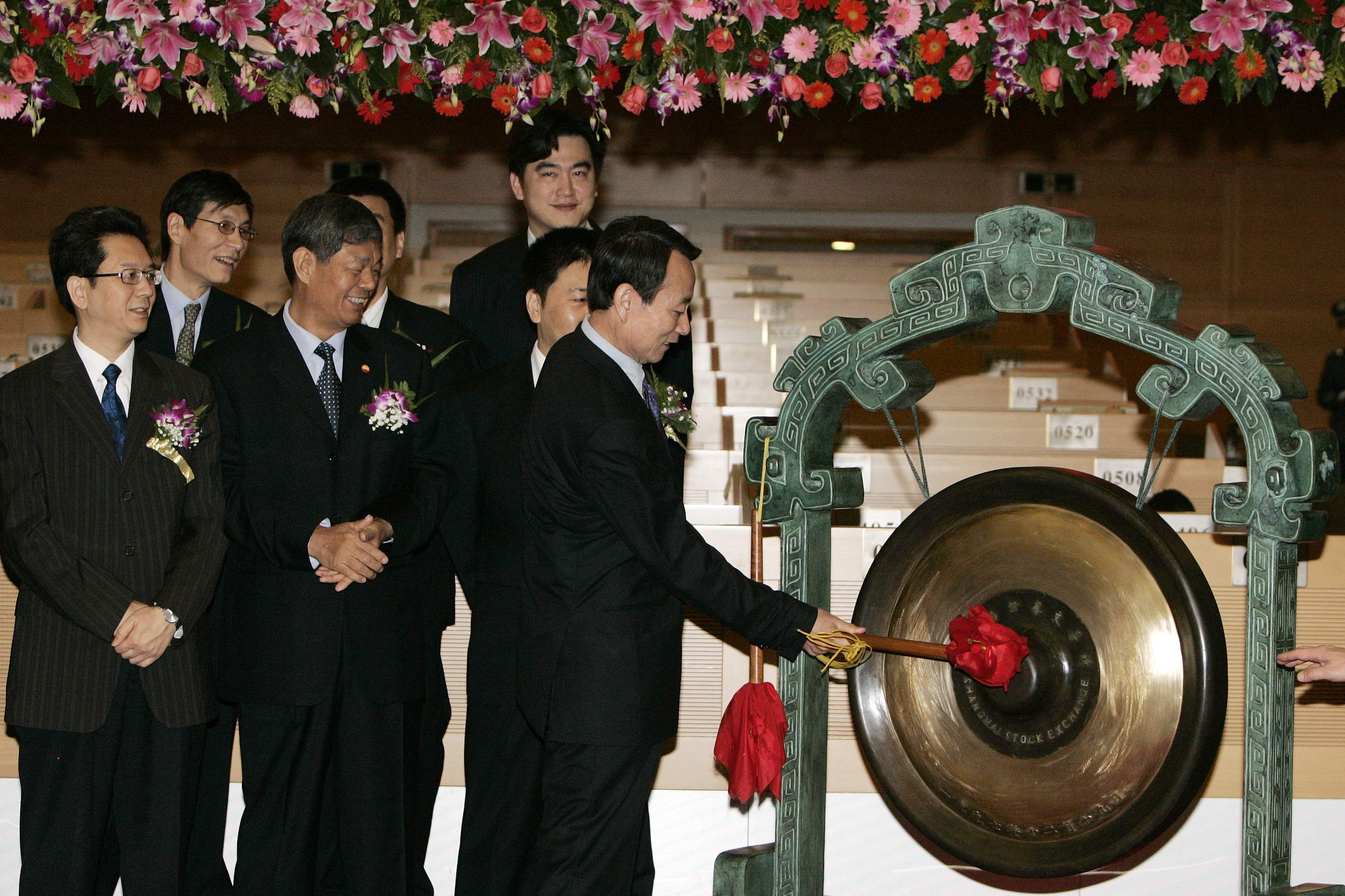 | Jiang Jiemin, chairman of PetroChina, hits the gong during a ceremony to mark PetroChina's listing in the trading hall of the Shanghai Stock Exchange November 5, 2007. Shares in PetroChina, which raised $9 billion in the world's biggest initial public offer this year, nearly tripled in their market debut and far exceeded analysts' forecast, buoyed by the company's position in the world's second-biggest energy market. [Agencies] |