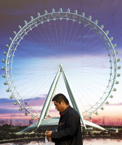 Work on what is said to be the world's largest ferris wheel started Monday. The Beijing Great Wheel, being built in the Chaoyang Park in the east, will stand at 208 m and aims to offer an unsurpassed view of the city when built by 2009. The landmark was originally scheduled for completion in time for the Olympic Games next year, but was delayed several times to improve its design, said sources from Great Wheel Corporation, a Singapore-based company that is jointly developing the project with Chaoyang Park authorities. Chaoyang Park is the venue for beach volleyball events during next year's Games. While there is currently no exact timetable for the wheel's completion, the company stated on its website that the $99 million project will be completed in 2009. The wheel's foundation was laid in May last year. The wheel, which has a diameter of 193 m, was designed by the same Dutch company that worked on the London Eye, the 135m structure built in the British capital in 1999 for the millennium celebrations. So far, Chaoyang Park authorities have not yet set a price for a ride on the attraction.