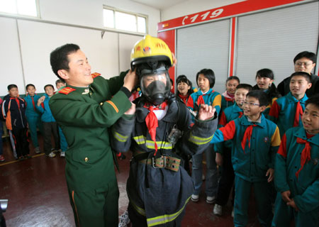 A girl tries on fire-protection suit at a base of local fire department in Jinan, November 5, 2007. [newsphoto]