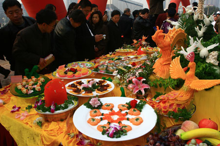 People view a variety of food displayed during the Lanzhou Food Festival, November 6, 2007. [newsphoto]