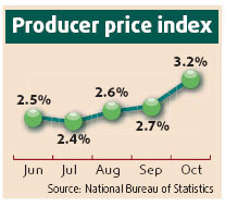 Updated: 2007-11-13 09:05 China's annual producer price index (PPI) rose to 3.2 percent in October from 2.7 percent in September, raising concerns that inflation will continue to remain high and further tightening measures may be in the pipeline.