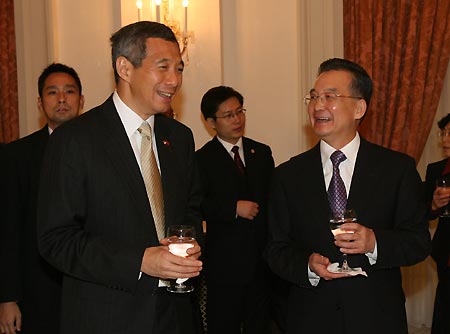 Chinese Premier Wen Jiabao (Front, R) talks with his Singaporean counterpart Lee Hsien Loong (front, L) before welcoming dinner in Singapore on November 18, 2007. [Xinhua]