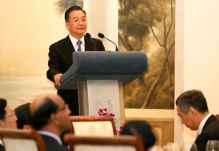 Chinese Premier Wen Jiabao addresses the welcoming dinner held by his Singaporean counterpart Lee Hsien Loong in Singapore on November 18, 2007. [Xinhua]