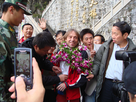 Tourists take photos with Alain Robert on Tianmen mountain,