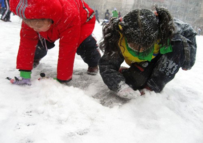 Students play with the snow on the playground in Jilin city of northeast China's Jilin Province, November 19, 2007. The strongest snow of this winter hit Jilin on Monday. [Xinhua]