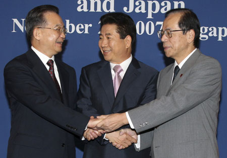 Chinese Premier Wen Jiabao (L), South Korean President Roh Moo-hyun (C) and Japanese Prime Minister Yasuo Fukuda shake hands before their trilateral meeting on the sidelines of the 13th Association of South East Asian Nations (ASEAN) Summit in Singapore November 20, 2007. [Agencies]