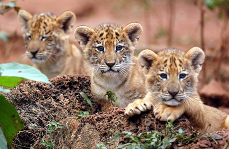 Three liger cubs rest in Hainan Tropical Wildlife and Botanical Garden in Haikou, Hainan Province November 20, 2007. The triplets born to "Young Blacky" and "Huan Huan" made their debut Tuesday in the wildlife park. The liger is a cross hybrid between a male lion and a female tiger. [Xinhua]