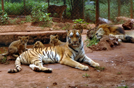 "Huan Huan", a female tiger, "Young Blacky", a male lion and their three liger cubs rest in Hainan Tropical Wildlife and Botanical Garden in Haikou, Hainan Province November 20, 2007. The triplets made their Tuesday in the wildlife park. The liger is a hybrid cross between a male lion and a female tiger. [Xinhua]