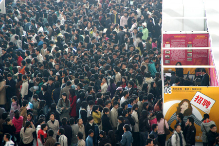 Updated: 2007-11-21 11:09 ![]() Crowds of job hunters flock to a job fair in Nanjing, East China's Jiangsu Province, November 20, 2007. Nearly 50,000 college graduates participated in the event. The job fair was the first of a series of recruitment events for the 427,000 students who would graduate next year in the province. Nearly 50,000 graduates participated in the event. [newsphoto]
