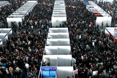 Updated: 2007-11-21 11:09 ![]() Crowds of job hunters flock to a job fair in Nanjing, East China's Jiangsu Province, November 20, 2007. Nearly 50,000 college graduates participated in the event. The job fair is the first of a series of recruitment events for the 427,000 students who will graduate next year in the province. Nearly 50,000 graduates participated in the event. [newsphoto]