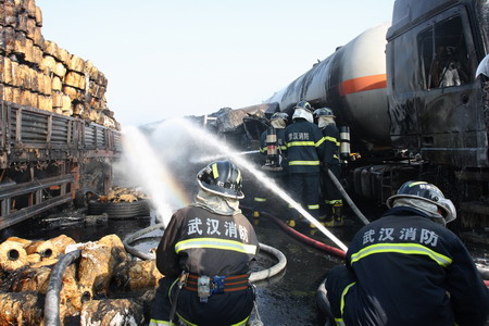 Firefighters try to extinguish a fire on a liquefied petroleum gas (LPG) tank truck that is caught up in a pileup on the Beijing-Zhuhai Expressway near Wuhan, Central China's Hubei Province November 21, 2007. Some 13 cars and trucks are involved in the accident, killing one person and causing fire on a tank truck, as dense fog reduced visibility Wednesday morning. [newsphoto]