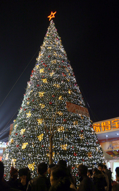 A photo taken on December 3, 2007 shows the largest Christmas tree in Beijing, capital of China. The Christmas tree, which was erected at Jiadebao square in Beijing, is 23 meters high and 10 meters in diameter. [Xinhua]