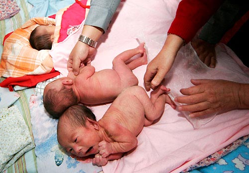 Triplets, two of whom are joined at their waist, were born on November 13, 2007 in the northern Chinese city of Tianjin. [Tianjin Daily]