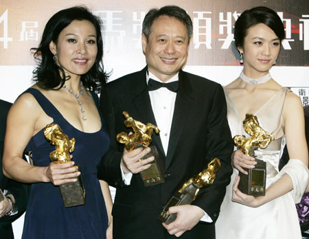Actress Joan Chen (L), director Ang Lee (C) and actress Tang Wei pose backstage at the 44th Golden Horse Awards in Taipei December 8, 2007. Chen won Best Leading Actress for "The Home Song Stories". Lee's "Lust, Caution" won him Best Feature Film and Best Director awards. Tang won the Best New Performer award. [Agencies]