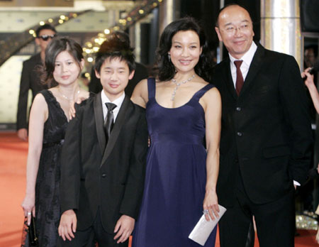 Actress Joan Chen (2nd R) and her husband Peter Hui (R) pose with their children on the red carpet at the 44th Golden Horse Awards in Taipei December 8, 2007. [Agencies]