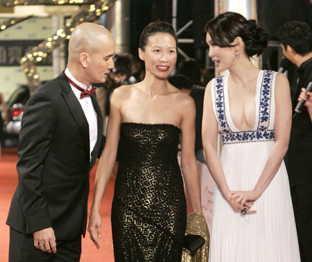 Singapore's actor Gurmit Singh (L), his wife Melissa (C) and actress Fann Wong pose as they arrive on the red carpet for the 44th Golden Horse Awards in Taipei December 8, 2007. [Agencies]