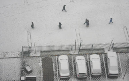 Local residents brave the snow in Beijing. The first snow of the winter hit Beijing in the morning on December 10, 2007. [newsphoto]