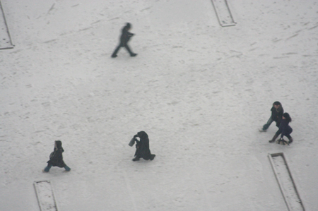 Local residents brave the snow in Beijing. The first snow of the winter hit Beijing in the morning on December 10, 2007. [newsphoto]