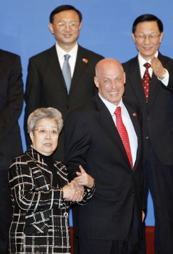 Chinese Vice-Premier Wu Yi (L) asks US Treasury Secretary Henry Paulson to look at journalists during the opening of The Third Strategic Economic Dialogue in Xianghe, near Beijing, December 12, 2007. [Agencies]