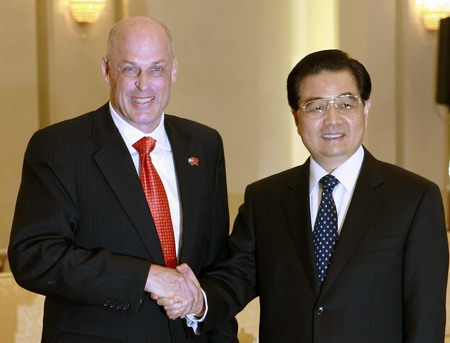 US Treasury Secretary Henry Paulson (L) shakes hands with China's President Hu Jintao during a meeting at the Great Hall of the People in Beijing December 13, 2007. Under agreements reached at the concluding day of the Third China-US Strategic Economic Dialogue (SED), qualified foreign-invested companies, including banks, will be allowed to issue renminbi-denominated stocks and bonds. [Agencies]