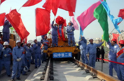 There will be five stations along the rail line - Beijing Southern Railway Station, Yizhuang in southeastern Beijing, Yongle and Wuqing in Tianjin, and Tianjin Railway Station. Its operation will enable more passengers to travel between Beijing and Tianjin, and help speed up the integration of the regional economies of the two major cities of North China. The Ministry of Railways has said in its mid- and long-term plan that a fast passenger transport rail network will be formed by the year 2020 to link up China's major cities and cities in three regions. "The completion of laying rail tracks on the Beijing-Tianjin high-speed railway signifies a breakthrough in high-speed railway construction technology that China has mastered," said Liu Zhijun, minister of Railways. The ministry said that many new technologies were used in the project for the first time in China's railway building history, which together enhances the railway's life span and produces low levels of pollution and noise. Up to 86 percent of the railway is built on bridges. The Beijing-Tianjin railway has been exemplary for other high-speed railway projects under construction, Liu said. |