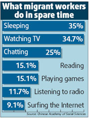In cultural terms, migrant workers live on a "lonely island" surrounded by an ocean of material prosperity in cities, according to the China Public Cultural Service Development Report 2007, which was compiled by the academy's cultural research center and the Shenzhen city cultural bureau. During their spare time, 35 percent sleep, 34.7 percent watch television and 25 percent shoot the breeze with their co-workers, according to a survey covering more than 8,000 migrant workers in 14 cities conducted by sociologists at Huazhong Normal University in Wuhan in 2005. The survey is part of the report. They live in a small, separate world, according to the report. "Urban residents and migrant workers live segregated lives in general, and the former are not much interested in the latter," it quoted sociologists at Zhejiang University in Hangzhou as saying. Fewer than a third of urban residents communicate with migrant workers regularly, and more than half do not like topics about migrant workers in their daily conversation, according to the sociologists. Although less educated, migrant workers are keen on a cultural life, according to the survey. The four things that they want most to get information and for self-improvement are: Television, technical training, books and magazines, and the Internet. But the survey said urban communities have not provided migrant workers any such facilities. Newspaper bulletins are the most commonly available, but only 22.7 percent of them have access to them. "The government is giving more and more money to the cultural sector, but the question is whether this money is spent in a way that reflects social equity and justice," said Zhang Jiangang, a researcher at Huazhong Normal University who is editor-in-chief of the report. Cities get the majority of the money. In Zhejiang Province alone, 11 cities have built "grand theaters", while 5,000 county-level cultural centers nationwide were closed between 2001 and 2006, which accounted for 12 percent of the all grassroots cultural centers. |
