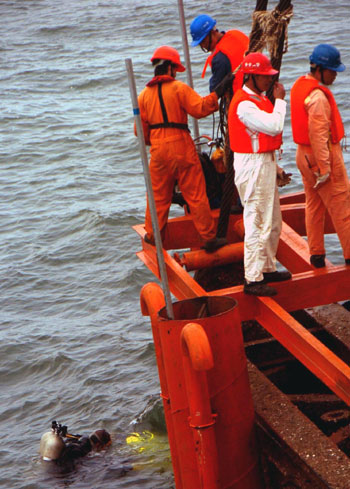 Divers make preparations before the salvage of Nanhai No. 1, an ancient merchant ship sank 800 years ago, December 21, 2007. [Xinhua]