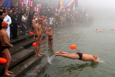 Winter swimming lovers are ready for the race. The first winter swimming race kicked off in Nanchong of Sichuan Province December 22, 2007. Thousands of winter swimming fans from home and abroad joined in this activity. The oldest competitor is 73 and the youngest is only 7 years old. [Xinhua]